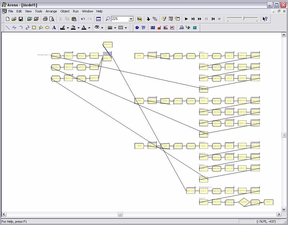 In most cases only simulation is applied to compute the performance indicators of a given design alternative of a flow production system. To develop and use a simulation model in order to produce statistically significant results takes a lot of time. First, a simulation model must be developed.Depending on the complexity of the structure of the material flow and the availability of templates provided by the simulation system, this may take a significant amount of time. In addition to the development of the model logic usually also an animation view of the modeled flow production system must be designed. For example, the model logic for a flow production system with converging material flow defined with the Arena® simulation software looks as follows: